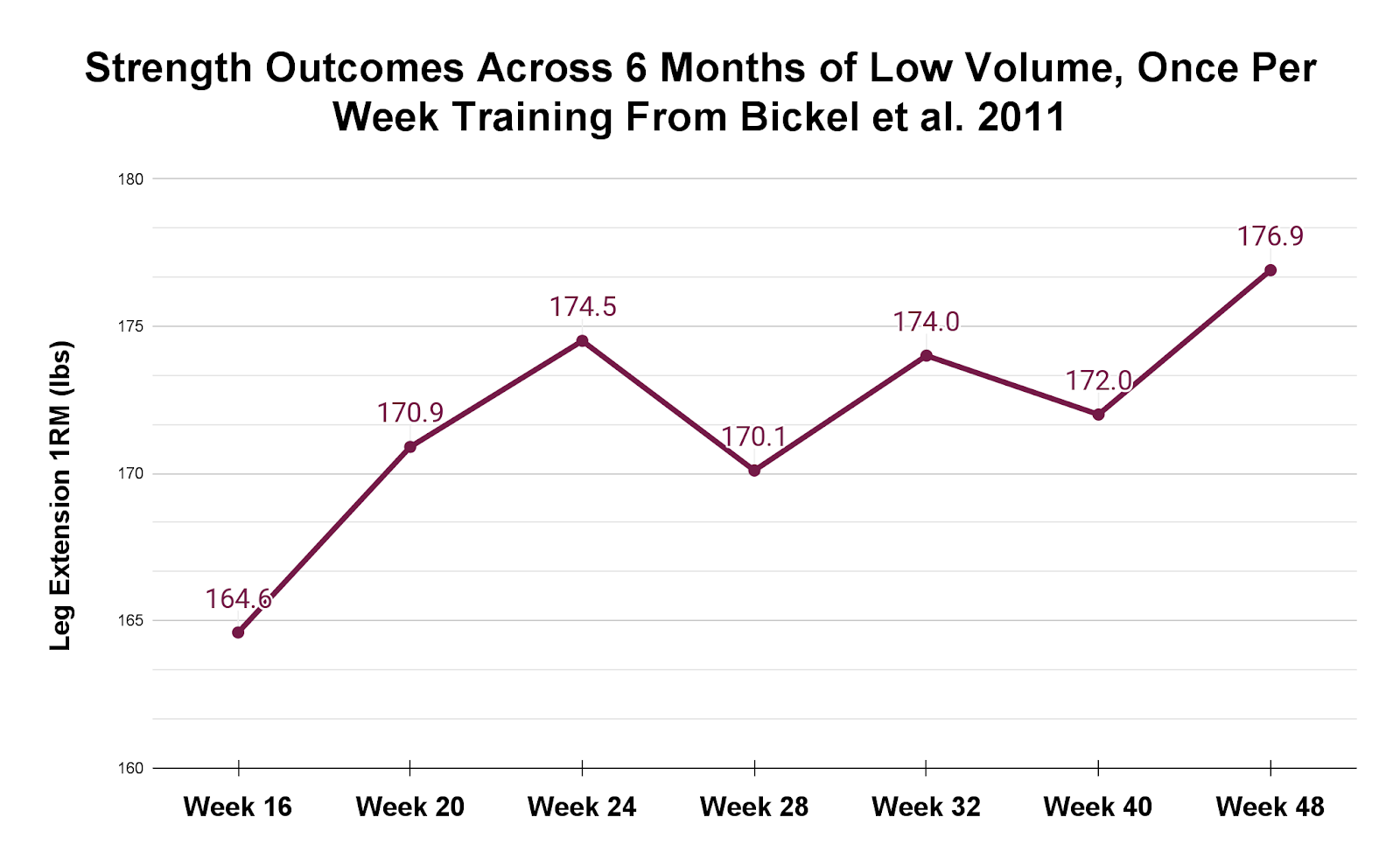 And, in one study by Bickel and Colleagues, following an initial 16-week period of training with higher volume, young subjects were able to continue making leg extension 1RM gains while completing 1 training session per week consisting of 1 set each of leg extension, leg press, and back squat for 8 months. (XII)