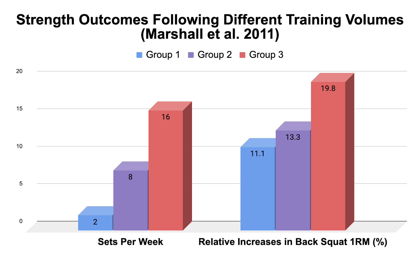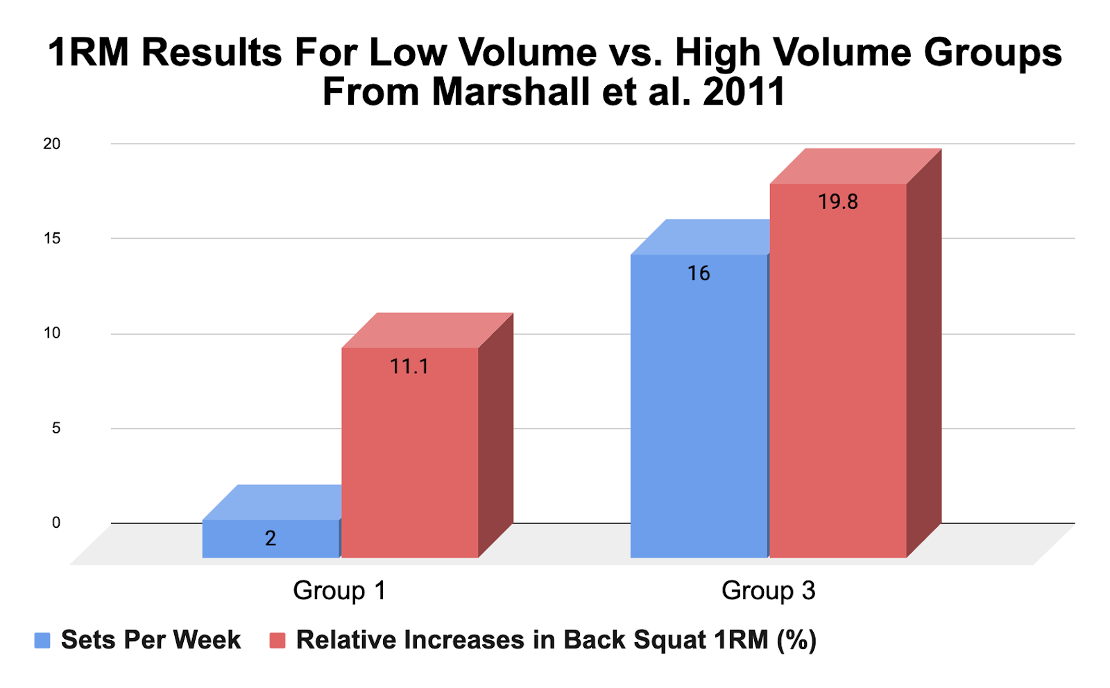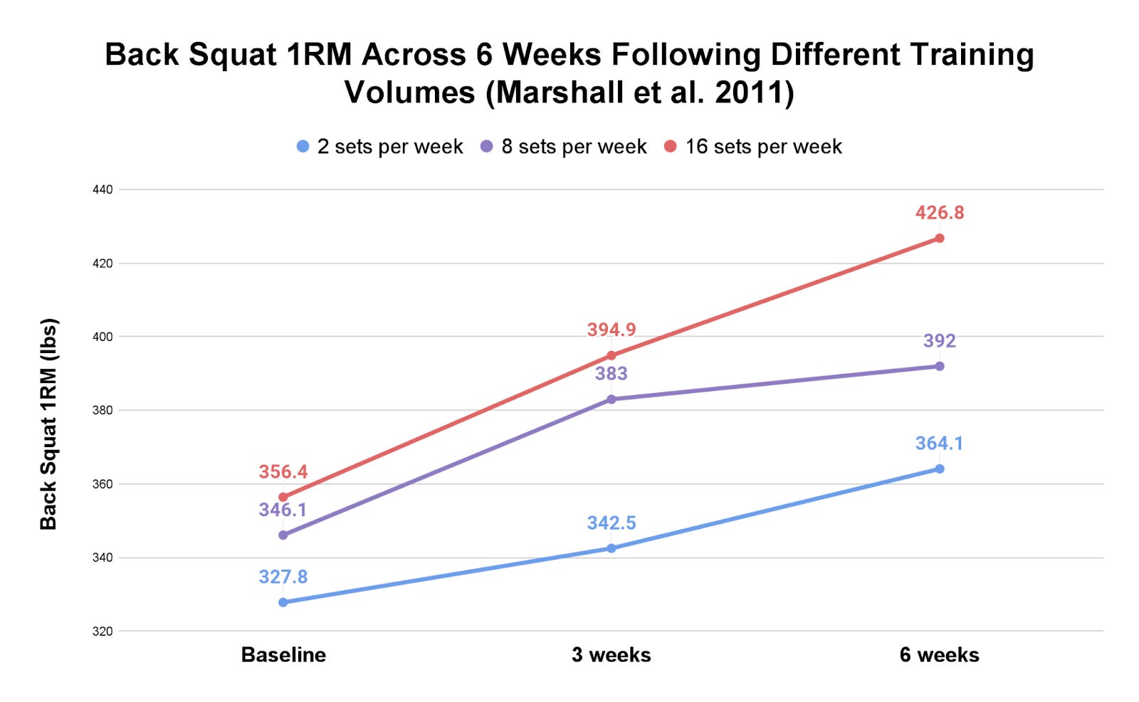 For example, in their 2011 trial, Marshall and Colleagues found that male subjects (average age 28) in the lowest volume group added ~36 lbs to their back squat 1-repetition-maximum (1RM) after 6 weeks of just 2 sets per week (1 set of ~11 reps of back squats at 80% of their 1RM performed twice per week). (IX) This is particularly notable considering that subjects in this low volume group had an average 1RM back squat of ~327 lbs at baseline. (IX)