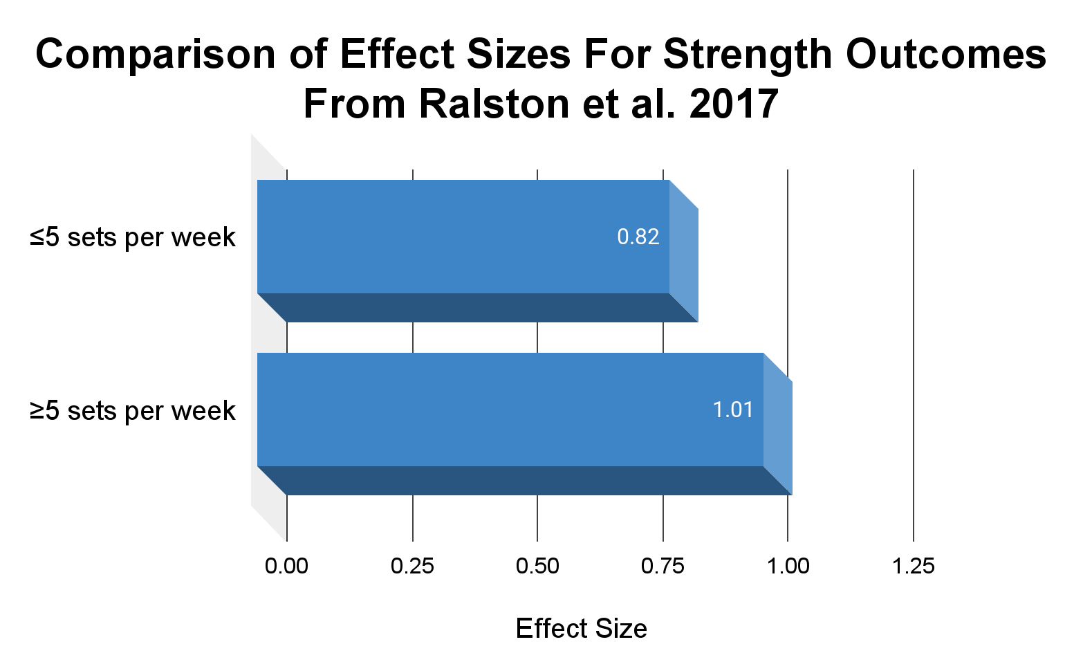Importantly, from a more zoomed out perspective, several meta-analyses support the idea that lower volume training can significantly increase strength. (I, XIV) Specifically, Ralston and Colleagues’ 2017 meta-analysis of 9 studies not only found that low weekly volume (5 or less sets per week) produced a large effect size for strength outcomes, but that moderate (5-9) and high (10+) weekly volumes only produced trivially greater increases in strength in comparison. (XIV)