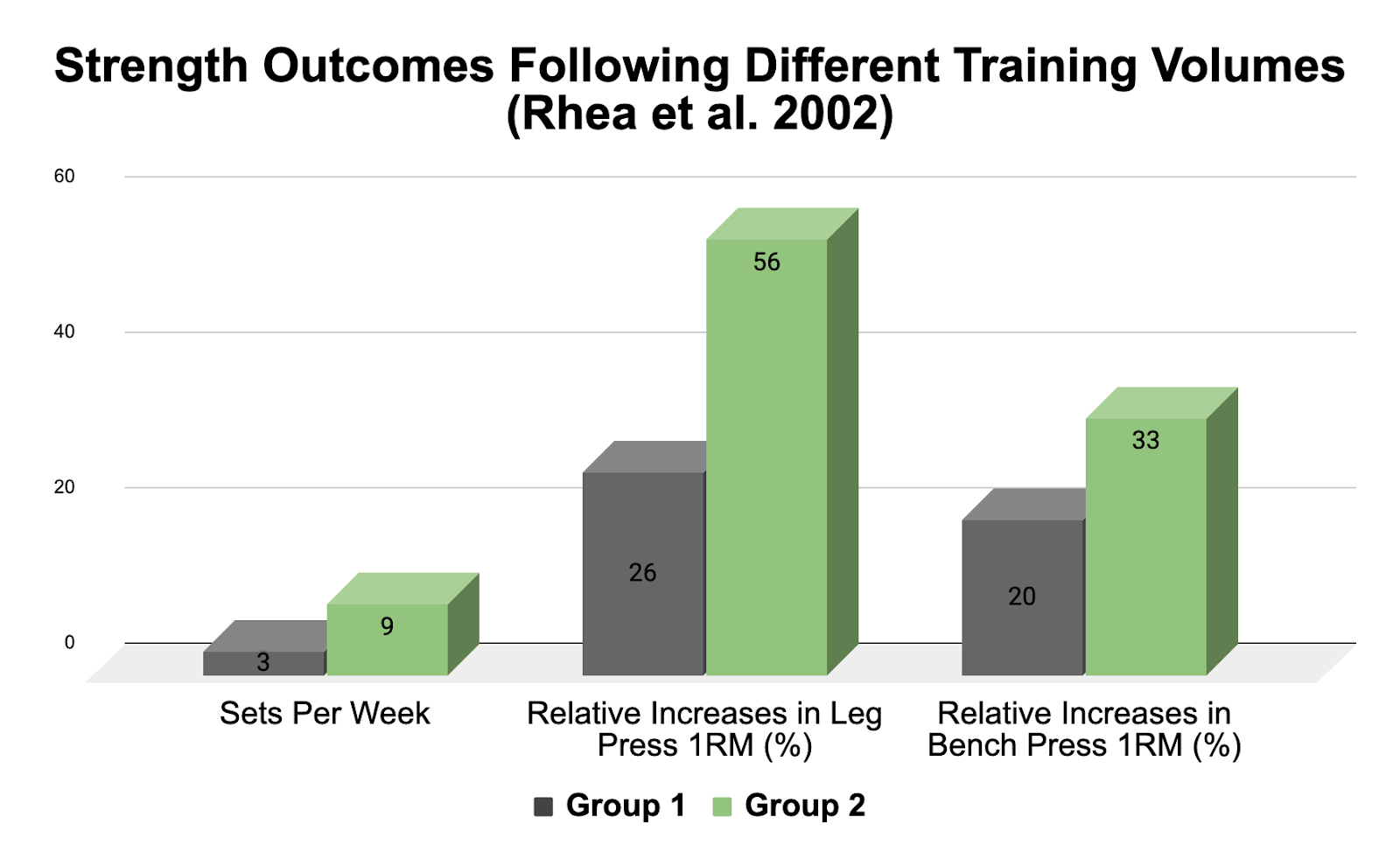 For example, in a study by Rhea and Colleagues, subjects completing 3 sets each of bench press and leg press per week (1 set per session spread out across 3 sessions per week) achieved ~45-60% of the 1RM gains achieved by subjects completing 9 sets of each exercise per week. (VI)